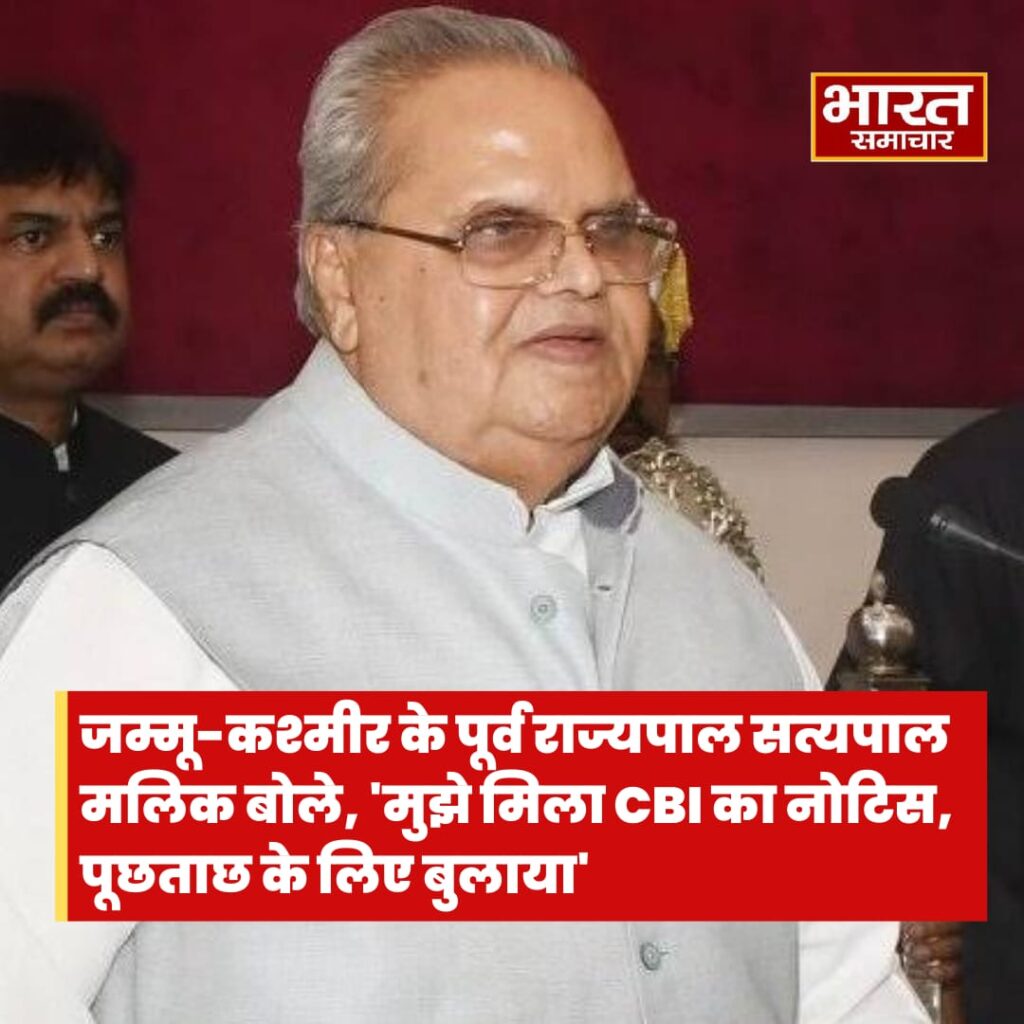 जम्मू-कश्मीर के पूर्व राज्यपाल सत्यपाल मलिक को CBI ने नोटिस दी है. रिलायंस इंश्योरेंस स्कैम मामले में सीबीआई ने सत्यपाल मलिक को नोटिस भेजकर पूछताछ के लिए बुलाया है. अक्टूबर 2021 में, मलिक ने आरोप लगाया कि जब वह जम्मू-कश्मीर के राज्यपाल थे, तो उन्हें दो फाइलों को क्लियर करने के लिए 300 करोड़ रुपये की रिश्वत की पेशकश की गई थी, जिनमें से एक “अंबानी” से संबंधित थी और दूसरी “आरएसएस कार्यकर्ता” से संबंधित थी.