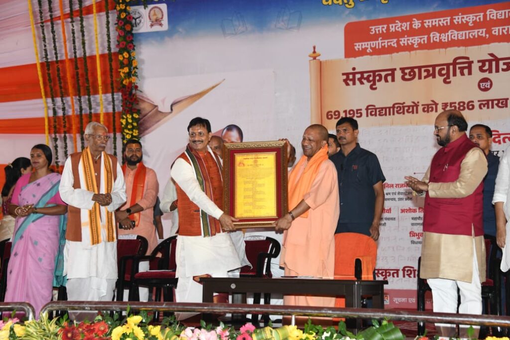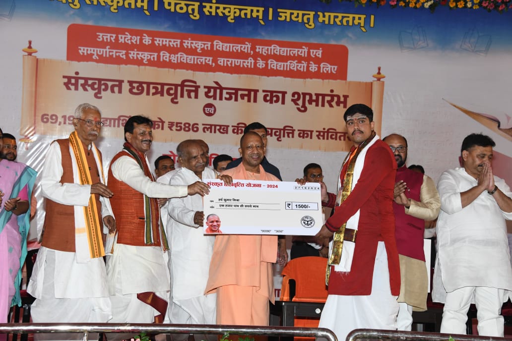 उत्तर प्रदेश में संस्कृत का अध्ययन करने वाले छात्र -छात्राओं को मुख्यमंत्री योगी आदित्यनाथ ने छात्रवृति की सौगात रविवार को दिया। वाराणसी के संपूर्णानंद संस्कृत विश्वविद्यालय में आयोजित कार्यक्रम में सीएम योगी आदित्यनाथ ने संस्कृत छात्रवृति योजना का शुभारंभ किया। इस मौके पर सीएम योगी आदित्यनाथ ने संस्कृत का अध्ययन करने वाले छात्र -छात्रों के लिए कई बड़े ऐलान किया। वही संस्कृत विद्यालयों में भी सुविधाओं को बढ़ाने के लिए सीएम ने अनुदान देकर संस्कृत के अध्ययन को बढ़ावा देने का ऐलान किया। मुख्यमंत्री योगी आदित्यनाथ ने रविवार को संस्कृत का अध्ययन करने वाले 6919 विद्यार्थियों को 586 लाख रुपए की छात्रवृति प्रदान किया। सीएम योगी के एक क्लिक से छात्रों के बैंक खाते में डिजिटल माध्यम से पैसे ट्रांसफर हुए।