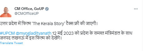 ट्वीट में लिखा गया है कि सीएम योगी अपने पूरे मंत्रिमंडल के साथ 12 मई 2023 को लखनऊ में ‘द केरल स्टोरी’ फिल्म देखेंगे. वहीं, सीएम योगी के आधिकारिक ट्विटर हैंडल पर लिखा गया है कि द केरल स्टोरी को यूपी में टैक्स फ्री किया जाएगा. योगी सरकार के इस निर्णय की सोशल मीडिया पर काफी तारीफ हो रही है. लोग हर किसी से थिएटर में जाकर फिल्म देखने और इसको प्रमोट करने के लिए आग्रह कर रहे हैं.
