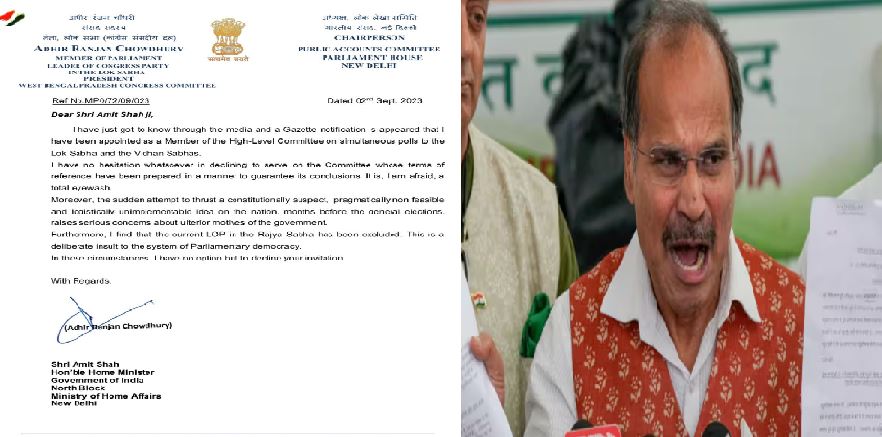 कांग्रेस नेता अधीर रंजन चौधरी ने गृहमंत्री अमित शाह को पत्र लिखकर ‘One Nation, One Election’ को लेकर पूर्व राष्ट्रपति रामनाथ कोविंद की अध्यक्षता में बनी हाई लेवल कमेटी का सदस्य बनने से इनकार किया है, गृह मंत्री अमित शाह को संबोधित पत्र में अधीर रंजन चौधरी ने लिखा कि मीडिया के माध्यम से पता चला है कि एक नोटिफिकेशन आया है लोकसभा और विधानसभाओं के चुनाव एक साथ कराने के लिए केंद्र सरकार ने एक कमेटी बनाई है. इस कमेटी में मुझे सदस्य के रूप में नियुक्त किया गया है.