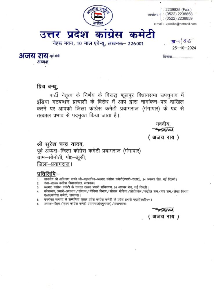 उत्तर प्रदेश कांग्रेस कमेटी की तरफ से जारी नोटिस में कहा गया कि पार्टी नेतृत्व के फैसले के खिलाफ फूलपुर विधानसभा सीट पर इंडिया गठबंधन के उम्मीदवार के खिलाफ नामांकन दाखिल किया। जिसकी वजह से जिला कांग्रेस कमेटी प्रयागराज (गंगापार) के पद से तत्काल प्रभाव से हटाया जाता है। इसके अलावा कांग्रेस अनुशासन समिति ने सुरेश यादव को फटकार लगाई है। इसके लिए समिति ने एक नोटिस जारी कर कहा कि पार्टी के फैसले के खिलाफ नामांकन दाखिल करना अनुशासनहीनता के दायरे में आता है। ऐसे में समिति ने बगावत करने वाले कांग्रेस नेता सुरेश यादव से 24 घंटे में जवाब मांगा है। उचित जवाब न मिलने पर अनुशासनात्मक कार्रवाई की दी गई चेतावनी।