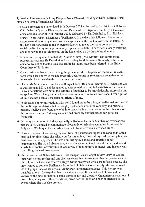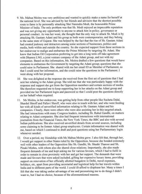 दर्शन हीरानंदानी का कहना है कि सांसद महुआ मोइत्रा कई बड़े नामों के साथ मिलकर काम कर रही थीं – मीडिया और विपक्ष दोनों में – जिनमें सुचेता दलाल, शार्दुल श्रॉफ और पल्लवी श्रॉफ, राहुल गांधी, शशि थरूर और पिनाकी मिश्रा, विदेशी मीडिया आउटलेट जैसे लोग शामिल थे। जैसे फाइनेंशियल टाइम्स, न्यूयॉर्क टाइम्स और बीबीसी और कई भारतीय प्रकाशन।