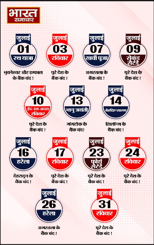 पूरे भारत में बैंक जुलाई के महीने में दूसरे शनिवार और रविवार की छुट्टियों सहित कुछ त्योहारों को लेकर 14 दिन बंद रहेंगे। बता दे कि बैंक की छुट्टियां एक क्षेत्र से दूसरे क्षेत्र में अलग-अलग होंगी। वहीं 14 दिन की इन छुट्टियों में से 8 छुट्टियां स्टेट स्पेसिफिक हैं। जबकि छह दिन वीकेंड पर बैंक बंद रहने वाले है