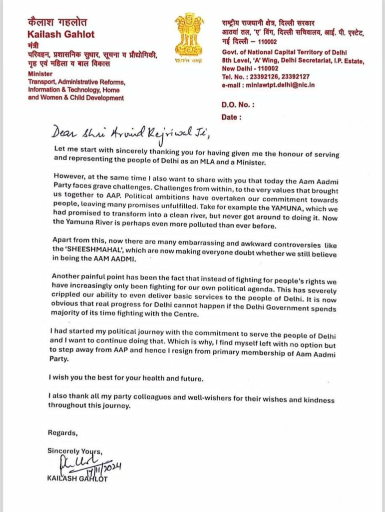Delhi: दिल्ली सरकार में मंत्री कैलाश गहलोत ने आम आदमी पार्टी (आप) से इस्तीफा दे दिया है, जिससे पार्टी को बड़ा झटका लगा है। गहलोत ने इस्तीफे के साथ ही पार्टी के राष्ट्रीय संयोजक अरविंद केजरीवाल को एक पत्र भी लिखा, जिसमें उन्होंने पार्टी से अलग होने का कारण स्पष्ट किया।