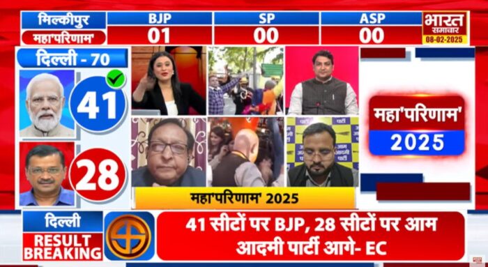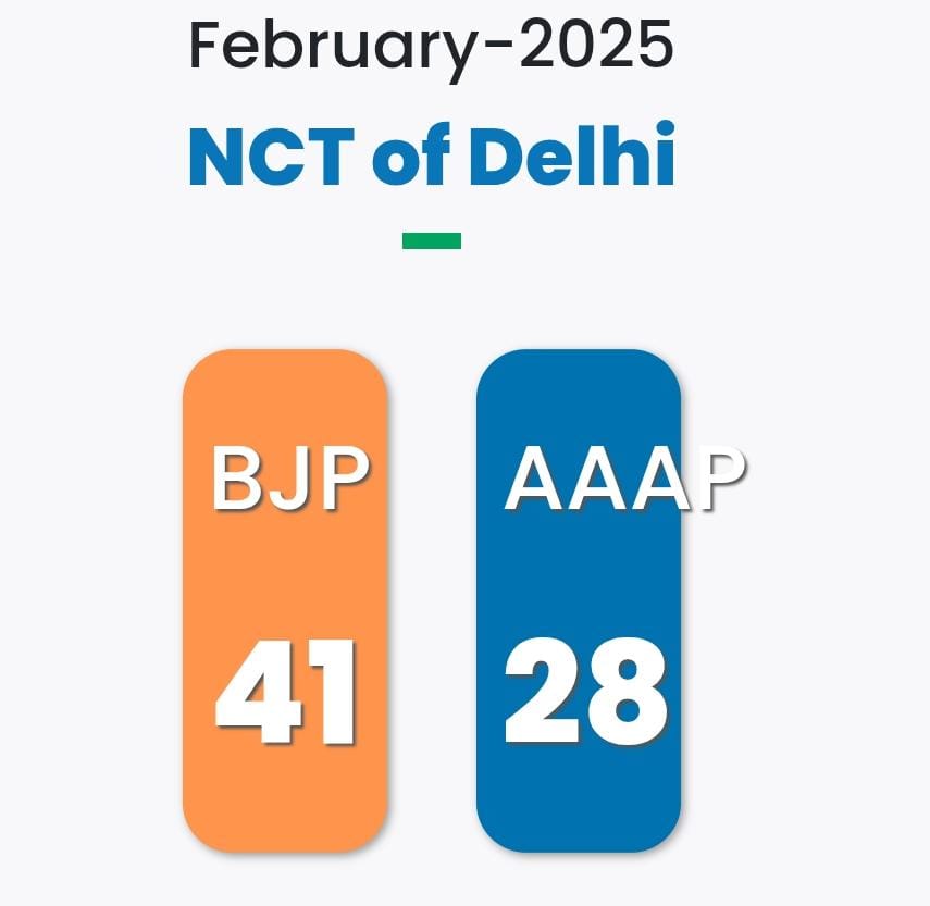 Delhi Election Result: दिल्ली विधानसभा चुनाव 2025 की मतगणना जारी है और चुनाव आयोग के ताजा रुझानों में भारतीय जनता पार्टी (BJP) ने बहुमत का आंकड़ा पार कर लिया है। बीजेपी अब 41 सीटों पर आगे चल रही है, जबकि आम आदमी पार्टी (AAP) 28 सीटों पर सिमटती दिख रही है।
