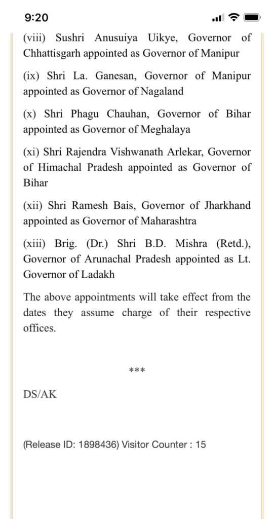 Breaking: कई राज्यपालों का एक साथ तबादला और इस्तीफा, देखें किसको कहां मिली नियुक्ति