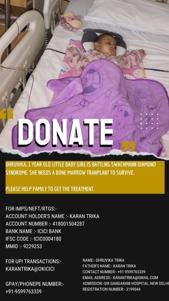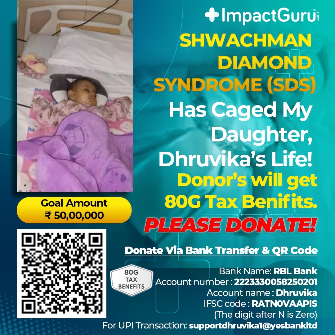 क्या होगा जब आप को पता चले कि आप जिससे बहुत प्यार करते हैं, उसे ऐसी बीमारी जिसके इलाज के लिए आप के पास पैसे नहीं है। ऐसे में एक ही रास्ता है घूट-घूट कर उसे मरने के लिए छोड़ दें। लेकिन कुछ ऐसे भी लोग हैं जो धनवान के साथ दयावान भी हैं। वह हमेशा ऐसे मरीजों के इलाज के लिए मदद को आग रहते हैं। ऐसे ही लोगों के इंतजार में एक साल की मासूम ध्रुविका भी है। यह बच्ची “Shwachman-Diamond Syndrome” ग्रसित है। यह एक आनुवंशिक विकार है। इससे वह जन्म से ही परेशान हैं। उन्हें लो ब्लड काउंट और बार-बार रक्त संक्रमण के कारण विभिन्न अस्पतालों में कई बार भर्ती कराया गया।
