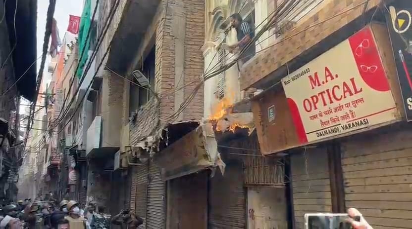 वाराणसी। उत्तर प्रदेश के वाराणसी में मुस्लिम बाहुल्य क्षेत्र दालमंडी में उस समय अफरा तफरी का माहौल हो गया, जब चौड़ीकरण के कार्य के दौरान बुलडोजर लेकर जर्जर मकानों को ध्वस्त करने पहुंची पुलिस और कर्मचारियों के साथ पत्रकारों को निशाना बनाते हुए एक युवक ने ज्वलनशील पदार्थ छिड़ककर आग लगा दी। हालांकि आग लगाने से पहले सभी ने वहां से समय रहते हट गए और आग युवक के मकान के बारजे में लग गई। पुलिस टीम ने तत्परता दिखाते हुए आग पर काबू पाया और आग लगाने वाले युवक को हिरासत में ले लिया। इस घटना ने जहां सभी को चौका दिया, तो वही दूसरी ओर इस घटना के बाद उपद्रवियों का हौसला बुलंद होता नजर आया और उन्होंने माहौल खराब करने की कोशिश करते हुए धार्मिक नारे के साथ ध्वस्तीकरण टीम के वापस जाने के नारे लगाने लगे। पुलिस ने हालात को गंभीरता से लिया और पुलिस अधिकारियों के निर्देश पर हल्का बल प्रयोग कर उपद्रवियों को खदेड़ दिया। जबकि इस दौरान करीब आधा दर्जन ऐसे लोगों को पुलिस न हिरासत में लिया जो ध्वस्तीकरण के कार्य में बांधा बन रहे थे और लोगों को भड़का रहे थे। मौके पर मौजूद काशी जोन के डीसीपी गौरव बंसवाल ने बताया कि आग लगाने वाला युवक आग लगाने के बाद वहां से फरार हो गया था, जिसे कुछ समय बाद हिरासत में लिया गया। जबकि दालमंडी में शांतिव्यवस्था को कायम करने के लिए हो भी जरूरत है उसे पूरी की जा रही है। उन्होंने साफ तौर पर कहा कि दालमंडी चौड़ीकरण का कार्य न्यायिक प्रक्रिया को पूरा करने के बाद किया जा रहा है, ऐसे में यदि कोई भी इस कार्य में अवरोध पैदा करेगा तो उसके खिलाफ कानूनी कार्रवाई की जाएगी।