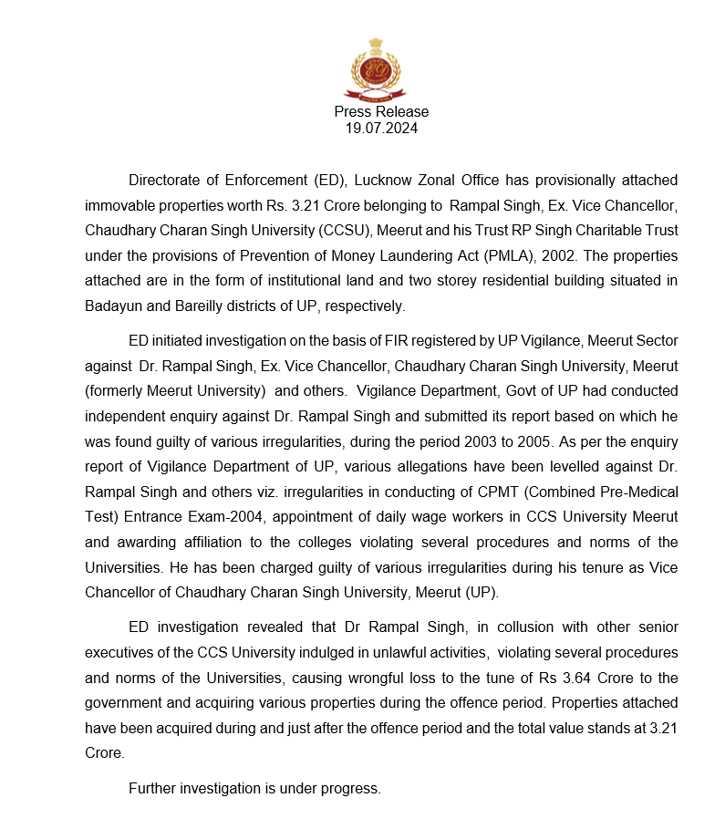 जानकारी के मुताबिक सिर्फ इतना ही नही बल्कि दैनिक वेतनभोगी कर्मचारियों की भर्ती में भी अनियमितताएं के आरोप है । प्रवर्तन निदेशालय की लखनऊ स्थित जोनल इकाई ने शुक्रवार को वर्ष 2004 में सीपीएमटी प्रवेश परीक्षा में धांधली के आरोपों में फंसे मेरठ के चौधरी चरण सिंह विश्वविद्यालय के पूर्व कुलपति रामपाल सिंह की 3.21 करोड़ रुपये की संपत्तियां जब्त की हैं।