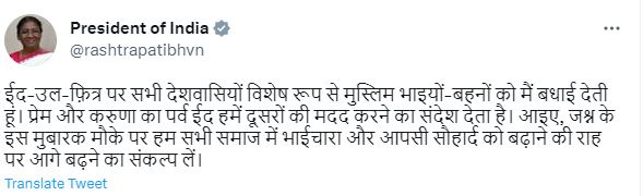 वहीं, राष्ट्रपति द्रौपदी मुर्मु ने देशवासियों को ईद की शुभकामनाएं देते हुए कहा- ईद-उल-फ़ित्र पर सभी देशवासियों व विशेष रूप से मुस्लिम भाइयों-बहनों को मैं बधाई देती हूं. प्रेम और करुणा का पर्व ईद हमें दूसरों की मदद करने का संदेश देता है. आइए, जश्न के इस मुबारक मौके पर हम सभी समाज में भाईचारा और आपसी सौहार्द को बढ़ाने की राह पर आगे बढ़ने का संकल्प लें.