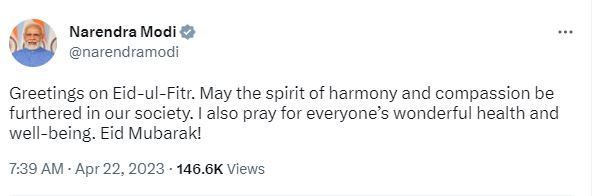 पीएम मोदी ने ईद की बधाई देते हुए कहा- ईद-उल-फितर की बधाई. हमारे समाज में सद्भाव और करुणा की भावना को आगे बढ़ाया जाए. मैं सभी के अच्छे स्वास्थ्य और कल्याण के लिए भी प्रार्थना करता हूं। ईद मुबारक!