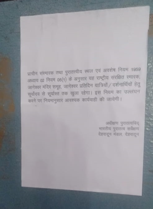 भारतीय पुरातत्व सर्वेक्षण की ओर से जागेश्वर धाम के मुख्य द्वार पर नोटिस चस्पा किया गया है. जिसमें लिखा गया है कि प्राचीन संस्मारक, पुरातत्वीय स्थल एवं अवशेष नियम 1959 अध्याय 2 नियम 5 (1) के अनुसार यह राष्ट्रीय संरक्षित स्मारक, जागेश्वर मंदिर समूह, जागेश्वर प्रतिदिन यात्रियों, दर्शनार्थियों के सूर्योदय से सूर्यास्त तक खुला रहेगा. इस नियम का उल्लंघन करने पर नियमानुसार आवश्यक कार्रवाई की जाएगी.