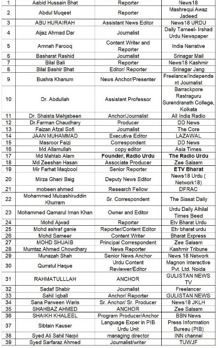 इसके बाद 17 जुलाई 2023 को हुई वर्चुअल ‘जूरी मीट’ में प्रतिष्ठित जूरी सदस्यों ने तमाम स्तर पर मूल्यांकन के बाद ‘e4m उर्दू जर्नलिज्म 40 अंडर 40’ सूची के लिए इनमें से 40 पत्रकारों का चयन किया था, जिनके नामों की घोषणा 29 सितंबर को आयोजित कार्यक्रम में की गई।