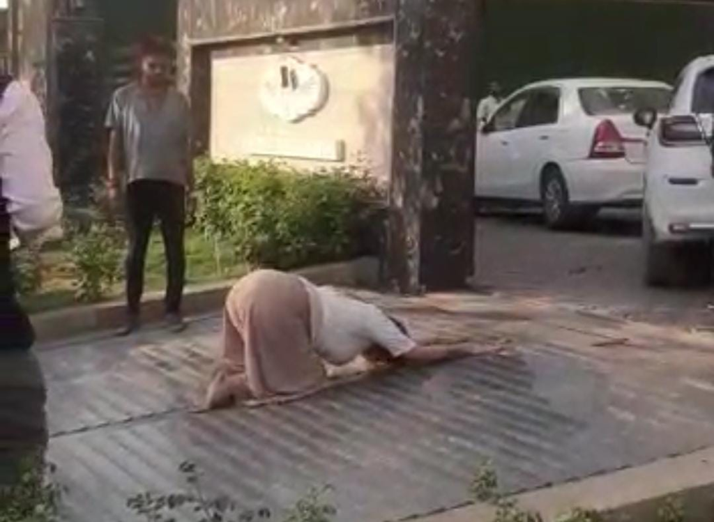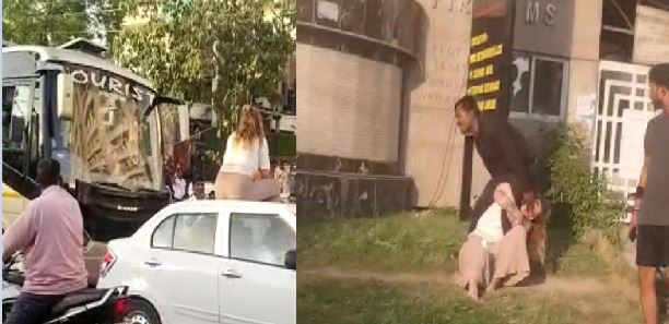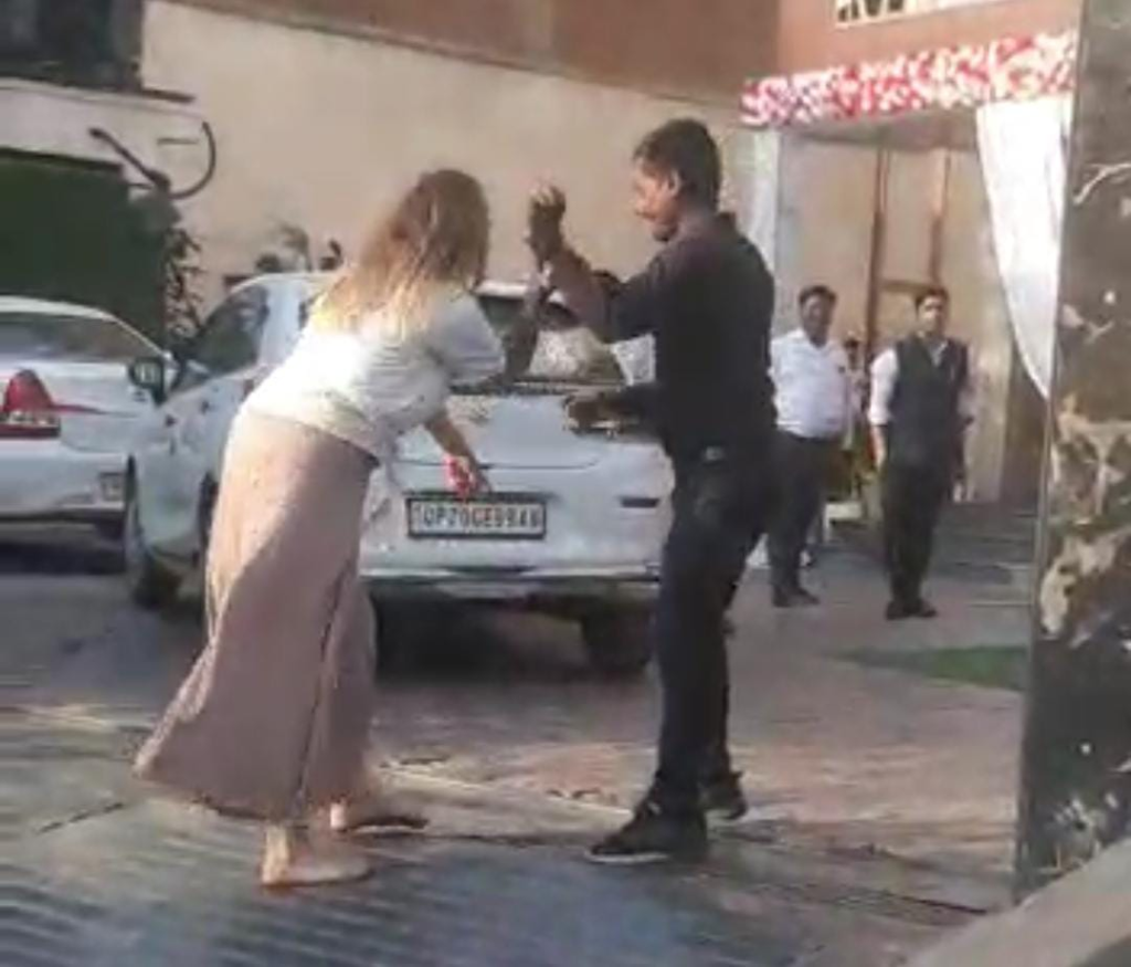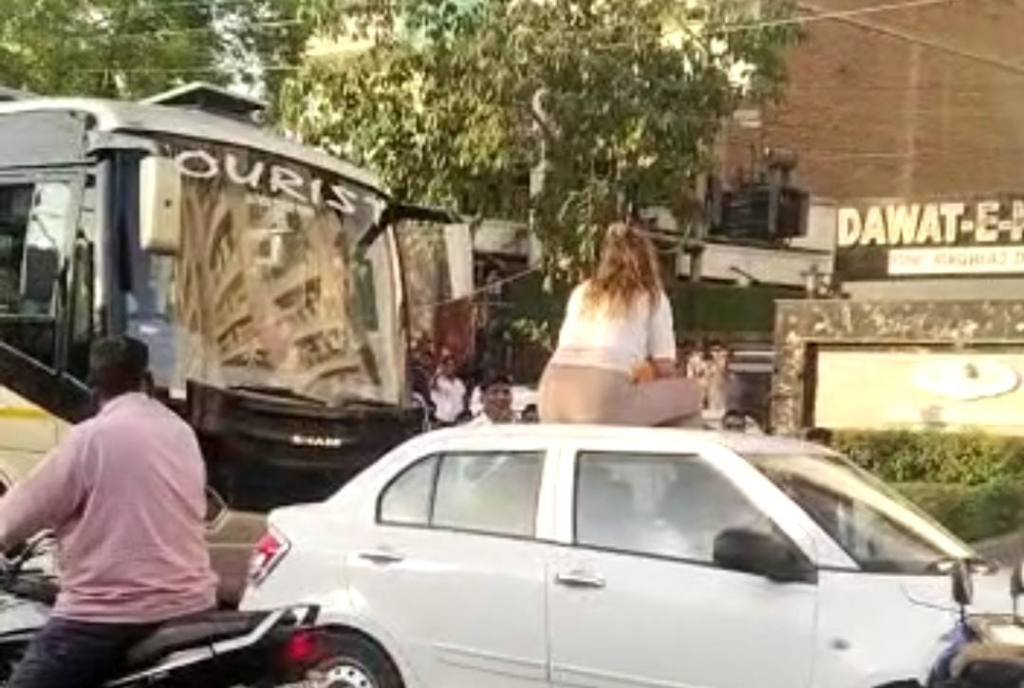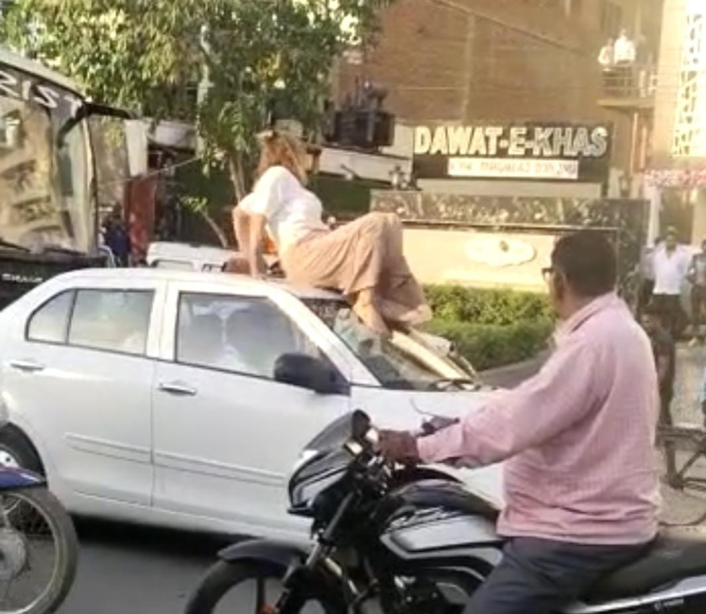 गाड़ी के बोनेट पर चढ़कर विदेशी महिला का हंगामा