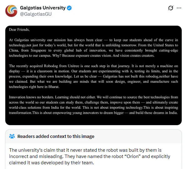 वायरल वीडियो के बाद, सोशल मीडिया प्लेटफॉर्म एक्स (पूर्व ट्विटर) ने इस पोस्ट पर एक ‘कम्युनिटी नोट’ जोड़ा। इसमें कहा गया कि यूनिवर्सिटी का दावा कि उन्होंने इसे अपना नहीं बताया, भ्रामक है। एक्स के कम्युनिटी नोट्स एक ऐसा फीचर है, जहां उपयोगकर्ता सही जानकारी और संदर्भ जोड़कर पोस्ट्स का फैक्ट-चेक करते हैं।