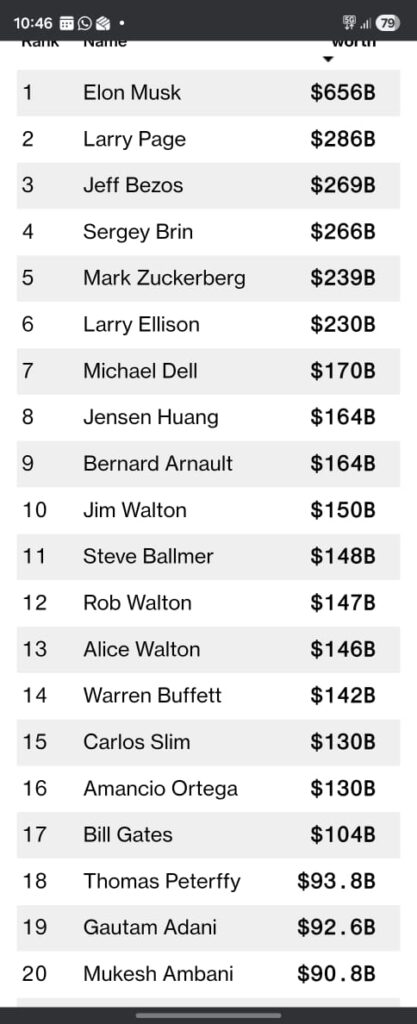 वैश्विक स्तर पर, टेस्ला के सीईओ एलन मस्क 656 बिलियन डॉलर की संपत्ति के साथ पहले स्थान पर बने हुए हैं। उनके बाद गूगल के लैरी पेज (286 बिलियन डॉलर) और अमेज़न के जेफ बेजोस का स्थान आता है। रिपोर्ट यह भी बताती है कि 2026 की शुरुआत में कई अरबपतियों के लिए आर्थिक नुकसान हुआ है। बर्नार्ड अरनॉल्ट ने इस वर्ष अब तक सर्वाधिक 44 बिलियन डॉलर की संपत्ति गंवाई है।