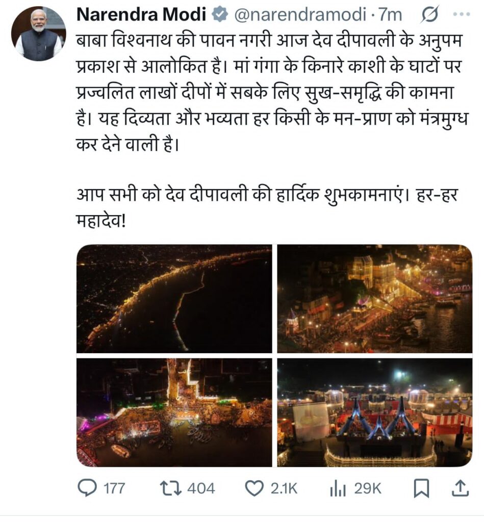 सीएम योगी के दीप जलाते ही काशी के घाटों पर लाखों दीप जलाए गए। वहीं वाराणसी के सांसद एवं देश के प्रधानमंत्री भी खुद को इस भव्यता और दिव्यता से दूर न रख पाए और ऑनलाइन माध्यम से इस देवदीपावली के पर्व को देखा। इसके साथ ही उन्होंने अपने सोशल मीडिया एकाउंट पर देवदीपावली की तस्वीरें सांझा की।