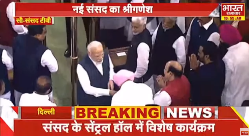 नई दिल्ली; देश की नई संसद का आज 19 सितंबर मंगलवार को भव्य शुभारंभ हुआ. इस अवसर पर सत्ता पक्ष व विपक्ष के नेताओं व सांसदों की मौजूदगी रही. पीएम मोदी ने सभी सांसदों से मुताकत की. इसके बाद राष्ट्रगान के साथ संसद के विशेष सत्र का प्रारंभ किया गया.