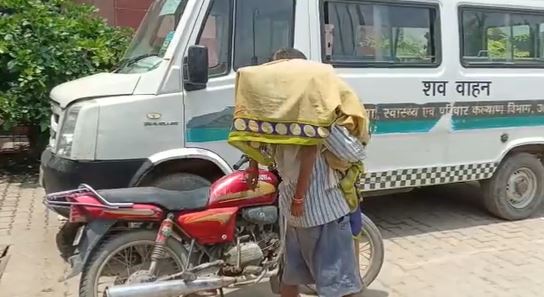 मजबूर पति कंधे पर शव रखकर घंटों अस्पताल में भटकता रहा लेकिन किसी ने कोई मदद नहीं की. पूरा मामला जिला अस्पताल के इमरजेंसी वार्ड का है. आपकों बता दें कि एम्बुलेंस की मांग करने पर डॉक्टरों ने बेतुका जवाब दिया, डॉक्टरों ने पति से कहा आपकी पत्नी हमारे यहां नहीं मरी है इसके लिए हम कुछ नही कर सकते हैं.