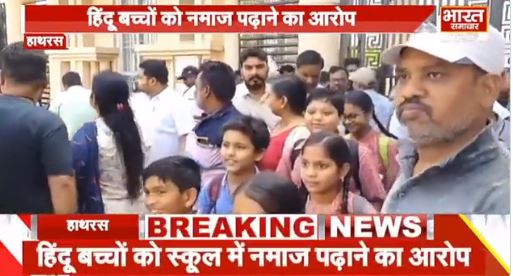 हाथरस; BLS इंटरनेशनल स्कूल पर हिंदू बच्चों को नमाज पढ़ाने के गंभीर आरोप लगे हैं. अभिभावकों का आरोप है कि उनके बच्चों को स्कूल में नमाज पढ़ाई जाती है. इसी के विरोध में अभिभावकों व हिंदू संगठनों के कार्यकर्ताओं ने स्कूल के गेट पर बैठकर हनुमान चालीसा का पाठ किया और नमाज पढ़ाए जाने का विरोध किया.