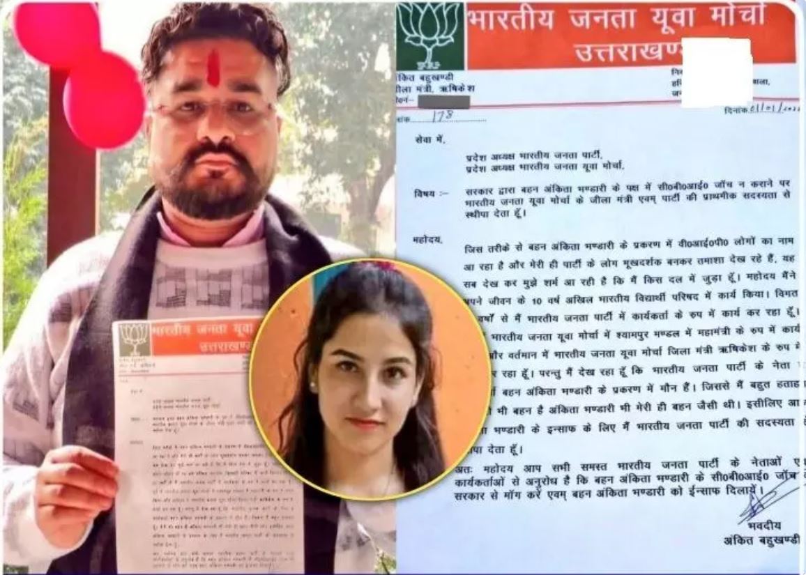 ऋषिकेश : उत्तराखंड के ऋषिकेश में भाजपा युवा मोर्चा के जिला मंत्री अंकित बहुखंडी ने अंकिता भंडारी हत्याकांड में न्याय में देरी और वीआईपी नामों पर पार्टी की चुप्पी के कारण अपनी नैतिक जिम्मेदारी लेते हुए अपने पद से इस्तीफा दे दिया है। अंकित ने अपनी पार्टी बीजेपी पर निशाना साधते हुए कहा कि, “अंकिता को न्याय दिलाने के बजाय भाजपा तमाशबीन बन गई है, मुझे शर्म आती है!”