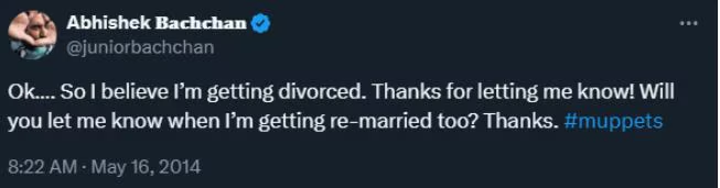 अभिषेक और ऐश्वर्या के बीच शादी के संबंधों की रिपोर्ट के बीच, उनकी पुरानी प्रतिक्रियाएं वायरल हो रही हैं। 2014 में जब उनके तलाक की अफवाहें सुर्खियों में थीं। अभिषेक ने अपने सोशल मीडिया पर इन अटकलों को लेकर एक पोस्ट किया था। जिसमें अभिनेता ने लिखा, “Ok… So I believe I’m getting divorced. Thanks for letting me know! Will you let me know when I’m getting remarried too? Thanks. #muppets.”