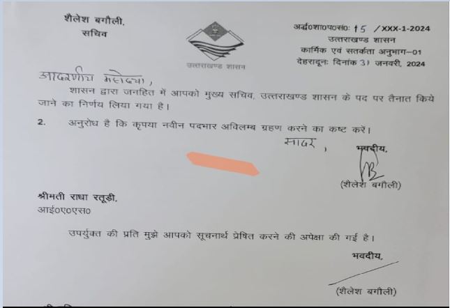 1988 बैच की आईएएस राधा रतूड़ी उत्तराखंड राज्य की पहली महिला मुख्य सचिव बन गईं। वर्तमान मुख्य सचिव संधु आज रिटायर हो रहे हैं। राधा रतूड़ी के पति अनिल रतूड़ी प्रदेश के डीजीपी रह चुके हैं।
