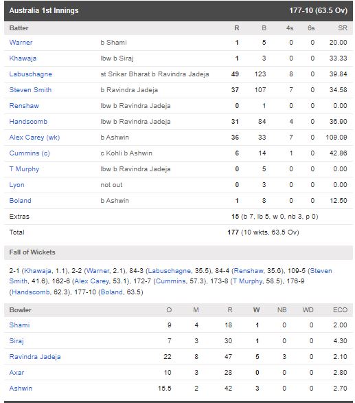 भारत ऑस्ट्रेलिया के बीच चार टेस्ट मौचों की सीरीज का पहला मैच विदर्भ क्रिकेट एसोसिएशन स्टेडियम नागपुर में खेला जा रहा है जिसकी शुरुआत गुरुवार से हो चुकी है। आस्ट्रेलिया ने टॉस जीतकर पहले बल्लेबाजी का फैसला किया। पहले गेंदबाजी करते हुए भारत का प्रदर्शन काफी उत्साह जनक रहा और आस्ट्रेलिया को चारों खाने चित कर दिया और आस्ट्रेलिया की पूरी टीम 63.5 ओवर में 177 रन बनाकर ऑलआउट हो गई। भारत की तरफ से सर्वश्रेष्ट प्रदर्शन करते हुए रविन्द्र जडेजा ने 5 विकेट लिए।