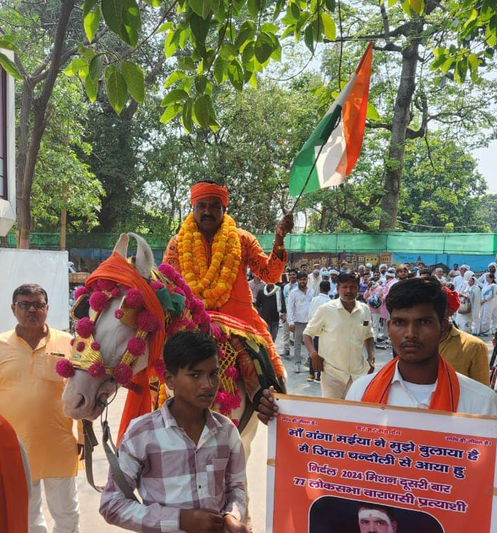वाराणसी लोकसभा सीट पर प्रधानमंत्री नरेंद्र मोदी के खिलाफ चुनावी मैदान में ताल ठोकने के लिए निर्दल प्रत्याशी भी चुनावी मैदान में उतर गए है। शुक्रवार को वाराणसी के जिला मुख्यालय पर चल रहे नामांकन प्रक्रिया में शामिल होकर नामांकन पत्र खरीदने मध्यप्रदेश के दतिया से आए वैद्य राम गुप्ता अपने साथ 25 हजार सिक्के लेकर पहुंचे। नामांकन पत्र खरीदने के लिए वैद्य राम गुप्ता 1 रुपए के 25 हजार सिक्कों को झोले में भरकर लाए थे। उन्होंने सिक्के लेकर नामांकन करने के पीछे का कारण बताया कि वह एक -एक रुपए करके लोकतंत्र के इस महापर्व में शामिल होने का सपना देखा था, देश में काफी भ्रष्टाचार है इस लिए अपने जमा पूंजी को लेकर वाराणसी लोकसभा सीट से चुनाव लड़ने पहुंचे है। वही चंदौली से घोड़े पर सवार हाथों में तिरंगा झंडा लिए प्रत्याशी विनोद सोनकर पहुंचे। देश में पेट्रोल और डीजल के बढ़े दामों के ऊपर सभी का ध्यान आकर्षित करने के लिए घोड़े पर सवार होकर चंदौली से वाराणसी तक का सफर तय कर नामांकन के लिए पहुंचा। इन अजब – गजब रंग के बीच कई निर्दल प्रत्याशी नामांकन फार्म न मिलने और नामांकन में हो रही देरी को लेकर जिला निर्वाचन और पुलिस पर आरोप भी लगाते नजर आए। वाराणसी में “मैं, जिंदा हूं” नाम से मशहूर संतोष कुमार नामांकन पत्र न मिलने से जिला मुख्यालय पर धरने पर बैठ गए। संतोष मूरत के अनुसार कागजों में मृत घोषित होने के बाद लगातार वह खुद को जिंदा साबित करने के लिए वाराणसी लोकसभा सीट पर नामांकन करना चाहते है। नामांकन पत्र के लिए तीन दिन से लगातार प्रयास कर रहे है, लेकिन चालान होने के बाद भी उन्हें नामांकन पत्र नही दिए जाने का आरोप लागया और जिला मुख्यालय पर धरने पर बैठ गए।