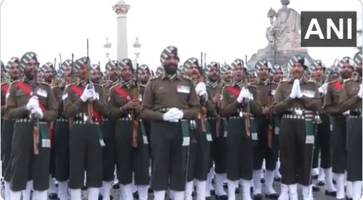 सैन्य दल ने 'सारे जहां से अच्छा हिंदोस्तां हमारा' की धुन पर मार्च अभ्यास किया।