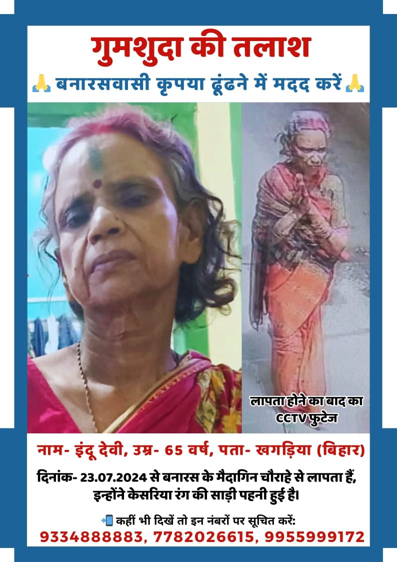 बनारस के खगड़िया की इंदु देवी लापता हो गई हैं। परिवार वालों के साथ में रेस्टोरेंट में खाना खाने के लिए जा रही थीं। इस दौरान वह रास्ता भटक गईं। 48 घंटे बीत जाने के बाद भी अभी तक उनका कुछ पता नहीं चल पाया है।