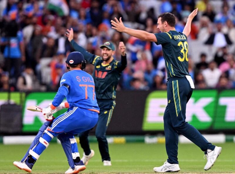 भारतीय टीम की पूरी बल्लेबाजी की श्रृंख्ला को तोड़ा नाथन एलिस ने जिन्होंने 19 वे ओवर में अभिषेक शर्मा को LBW किया। जबकि जसप्रीत बुमराह जीरो पर रनआउट हो गए।