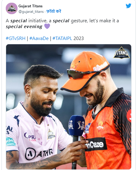बता दें कि गुजरात टाइटंस लोगों में कैंसर के खिलाफ जागरूकता फैलाने के लिए ये खास जर्सी पहनेगी. टॉस के वक्त गुजरात टाइटंस के कप्तान हार्दिक पांड्या ने कहा कि यह कैंसर मरीज को सपोर्ट करने के लिए हमारी खास मुहिम है.दरअसल, कैंसर मरीज को सपोर्ट करने के लिए हम इस नई जर्सी को पहनकर मैदान पर उतरे हैं. यह हमारे लिए बेहद खास है… वहीं, सोशल मीडिया पर गुजरात टाइटंस टीम की नई जर्सी लगातार सुर्खियां बटोर रहा है. इसके अलावा सोशल मीडिया यूजर्स लगातार कमेंट्स कर अपनी प्रतिक्रिया दे रहे हैं.
