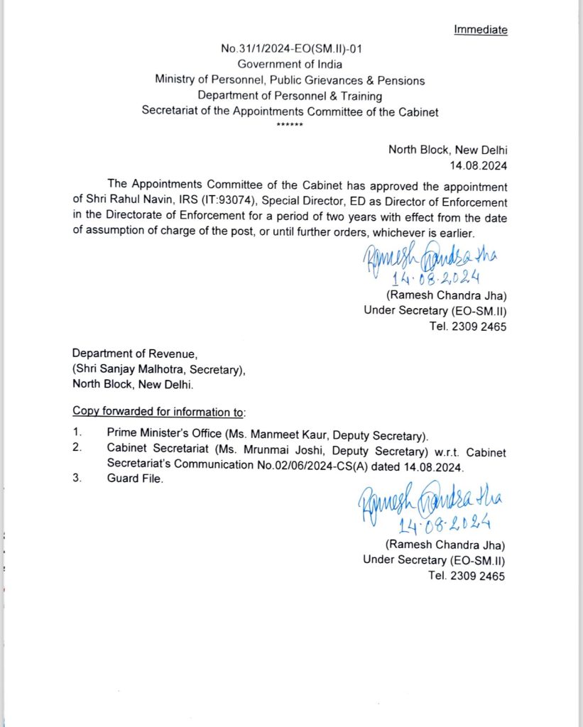 इस बात की पुष्टि केंद्रीय कार्मिक मंत्रालय द्वारा जारी किए गए नोटिफिकेशन में की गई है बता दें कि नवीन इस समय प्रवर्तन निदेशालय (ईडी) में विशेष निदेशक के रूप में काम कर रहे हैं। बता दें कि राहुल नवीन को इससे पहले सरकार ने ED का कार्यकारी डायरेक्टर बनाया था। नोटिफिकेशन में बताया गया है कि ईडी के डायरेक्टर पद पर राहुल नवीन की नियुक्ति कार्यभार संभालने की तारीख से दो साल तक की अवधि के लिए की गई है।
