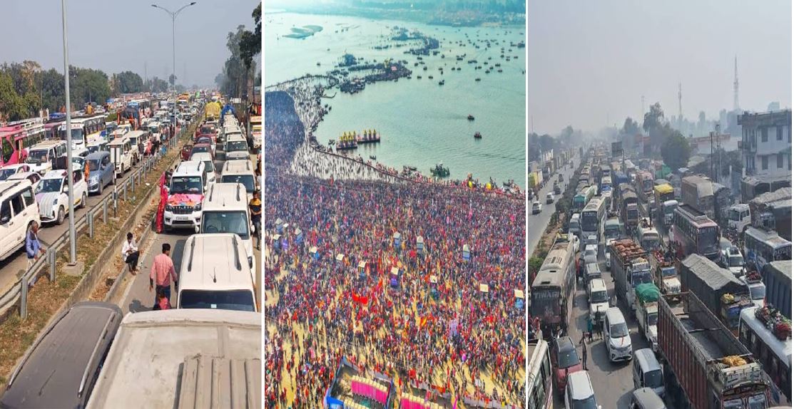 महाकुंभ को लेकर इस समय प्रयागराज समेत कई शहरों में भारी भीड़ देखने को मिल रही है। हालात ये है कि सड़कों पर पर आदमियों की भारी भीड़ और गाड़ियों का रेला लगा हुआ है। प्रयागराज के आसपास जितने भी जिले वहां तक पहुंचना असंभव है। गाड़ियों की लम्बी कतार और आदमियों की भारी भीड़ देखकर कोरोना का लॉकडाउन जैसी हालत हो गयी है।