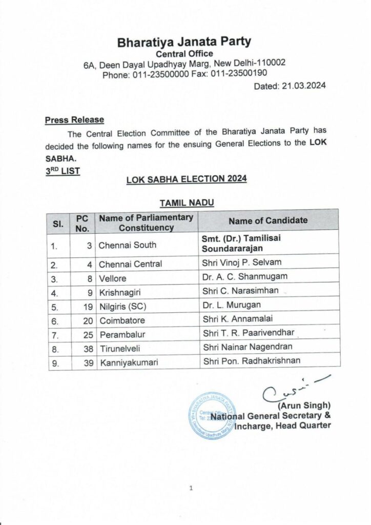 भजापा ने तमिलनाडु प्रदेश अध्यक्ष अन्नामलाई को कोयंबटूर लोकसभा सीट से, तेलंगाना के राज्यपाल पद से इस्तीफा देने वाली तमिलिसाई सुंदरराजन को चेन्नई साउथ से, मध्य चेन्नई सीट से वीपी सेलवम, वेलोर से एसी षणमुगम, कृष्णागिरी से सी. नरसिम्हन और पेराम्बलूर से टीआर पारिवेंदर को मैदान में उतार है।