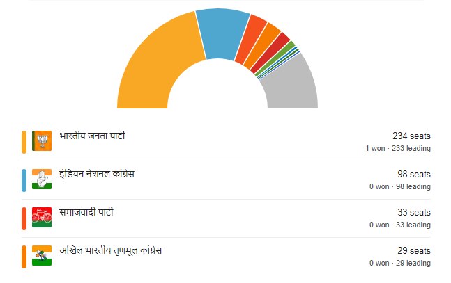कन्नौज से अखिलेश यादव बढ़त बनाए हुए हैं। जबकि आजमगढ़ से निरहुआ पीछे चल रहे हैं। धर्मेंद्र यादव आगे चल रहे हैं। वहीं सैफई सीट से सपा प्रत्याशी डिम्पल यादव आगे चल रही हैं। चुनाव आयोग के शुरुआती रुझानों के अनुसार, भाजपा 238 सीटों पर आगे चल रही है, कांग्रेस 96 सीट पर आगे चल रही है।
