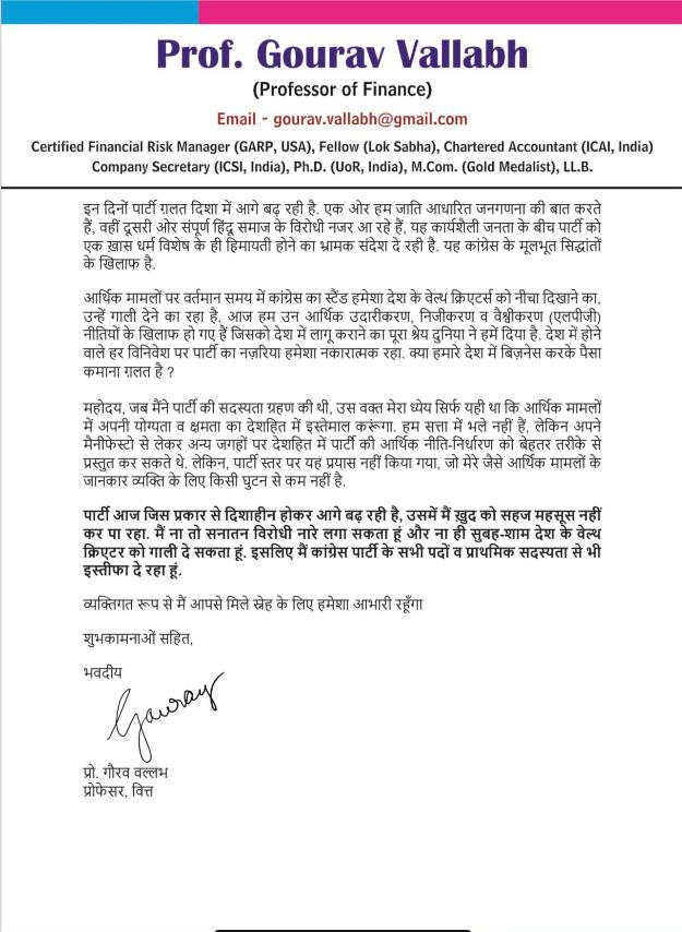 उन्होंने कहा, “मैं ना तो सनातन विरोधी नारे लगा सकता हूं और ना ही सुबह-शाम देश के वेल्थ क्रिएटर्स को गाली दे सकता। इसलिए मैं कांग्रेस पार्टी के सभी पदों व प्राथमिक सदस्यता से इस्तीफा दे रहा हूं।”