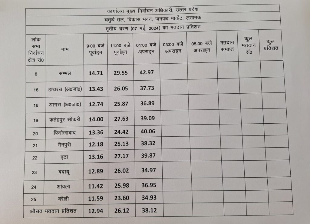 आयोग द्वारा जारी आंकड़ों के अनुसार संभल में 42.97, हाथरस में 37.73, आगरा में 36.89, फतेहपुर सीकरी में 39.09, फिरोजाबाद में 40.06, मैनपुरी में 38.32, एटा में 39.87, बदायूं में 34.95, आंवला में 36.95 और बरेली में 34.93 प्रतिशत मतदान हुए। दोपहर एक बजे तक कुल औसत मतदान 38.12 प्रतिशत मतदान हुआ है।