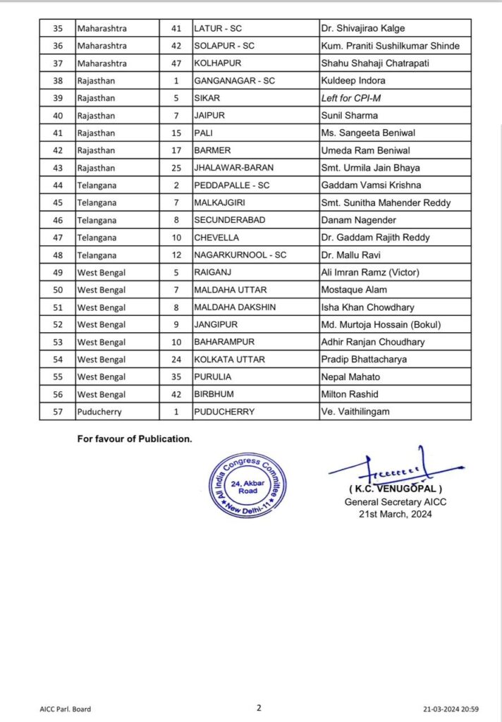 लोकसभा चुनाव को लेकर कांग्रेस ने अरुणाचल प्रदेश, गुजरात, कर्नाटक, महाराष्ट्र, राजस्थान, तेलंगाना, पश्चिम बंगाल और पुडुचेरी के लिए अपने 57 उम्मीदवारों के नाम घोषित कर दिए हैं। पश्चिम बंगाल कांग्रेस के अध्यक्ष अधीर रंजन चौधरी को उनकी मौजूदा सीट बहरामपुर से टिकट दिया गया है।