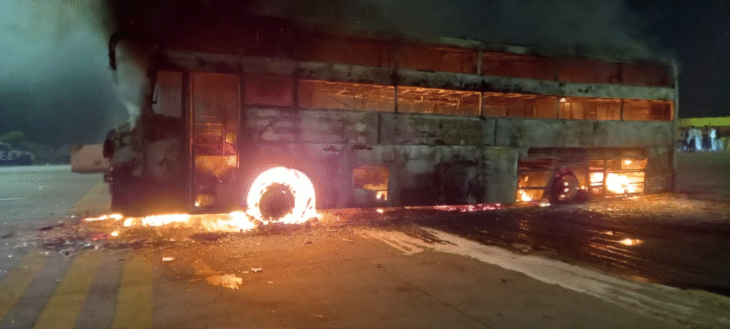 लखनऊ: आगरा एक्सप्रेस-वे पर दिल्ली से गोंडा जा रही एक एसी बस में अचानक आग लग गई। हादसा उस वक्त हुआ जब बस का टायर फट गया, जिससे भीषण आग ने पूरी बस को अपनी चपेट में ले लिया। देखते ही देखते बस आग का गोला बन गई और धुएं का गुबार करीब दो किलोमीटर दूर तक दिखाई दिया।