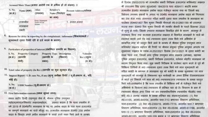 Lucknow: राजधानी लखनऊ के हजरतगंज थाने के मालखाने से कीमती सामान गायब होने का मामला सामने आया है. इस मामले में तत्कालीन हेड कांस्टेबल प्रिय कुमार त्रिपाठी पर आरोप लगाए गए हैं. यह मामला अब एक नया मोड़ ले चुका है, क्योंकि मृतक हेड कांस्टेबल के खिलाफ इंस्पेक्टर विक्रम सिंह ने मामला दर्ज कराया है.