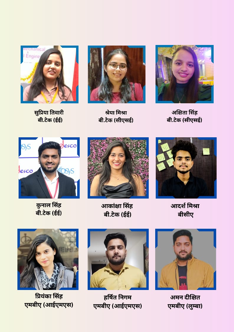 प्लेसमेंट इंचार्ज डॉ. हिमांशु पाण्डेय ने बताया कि प्लैनेट स्पार्क कंपनी के कैंपस प्लेसमेंट ड्राइव में बीटेक (कंप्यूटर साइंस इंजीनियरिंग) के 2 छात्रों (अक्षिता सिंह एवं श्रेया मिश्रा) और बीटेक (इलेक्ट्रिकल इंजीनियरिंग) के 3 छात्रों (सुप्रिया तिवारी, कुणाल सिंह एवं आकांक्षा सिंह) एवं बीसीए के छात्र आदर्श मिश्रा का चयन बिज़नेस डेवलपमेंट कॉउंसलर के पद पर 6.5 लाख प्रतिवर्ष के पैकेज पर चयन हुआ |