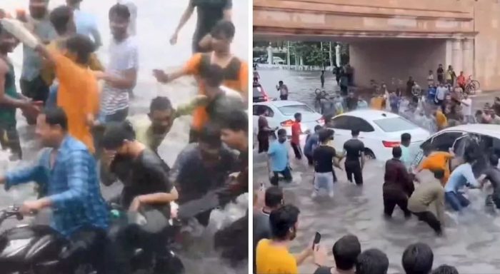 पूरा मामला राजधानी लखनऊ के रिहायशी इलाका गोमती नगर का है। जहां बुधवार को मूसलाधार बारिश ने लोगों को राहत भले ही न दी हो मगर शर्मिंदा जरूर कर दिया। दरअसल, मूसलाधार बारिश से राजधानी के ज्यादातर इलाकों में भारी जलजमाव जैसी स्थिति पैदा हो गई। कुछ ऐसा ही नजारा लखनऊ के ताज होटल के सामने भी था। मगर यहां पानी से डूबी सड़क पर हुड़दंगियों का कब्जा दिखा। जो जलजमाव से बचकर निकलते वाहन सवारों से अभद्रता कर रहे थे। रास्ते से निकलने वाले दोपहिया सवारों को जबरन पानी में धकेल रहे थे। इसी बीच एक बाइक से जा रही लड़की पर इन हुड़दंगियों ने पानी फेंकना शुरू कर दिया। जब युवती के साथ मौजूद युवक ने इसका विरोध किया तो उसे भी धक्का देकर पानी में गिरा दिया गया। हद तो तब हो गई जब अपनी पत्नी को बचाने के लिए युवक हाथ जोड़े खड़ा हो जाता है। मगर उन बेशर्मों के चेहरे पर एक शर्म का एक शिकश्त भी नहीं नजर आता है।