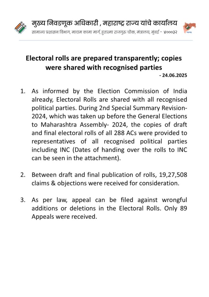 चुनाव आयोग ने एक अधिकारिक पत्र जारी करते हुए स्पष्ट किया कि सभी मान्यता प्राप्त राजनीतिक दलों को, जिसमें कांग्रेस (INC) भी शामिल है, वोटर लिस्ट की प्रतियां समय पर सौंपी गईं। 24 जून 2025 को जारी किए गए पत्र में चुनाव आयोग ने बताया कि 288 विधानसभा क्षेत्रों की ड्राफ्ट और अंतिम वोटर लिस्ट को कांग्रेस सहित सभी राजनीतिक दलों को निर्धारित समय सीमा के भीतर उपलब्ध कराया गया।