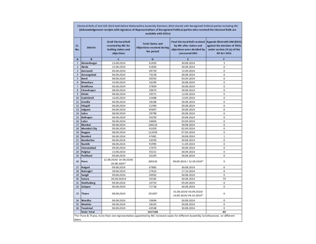 - 288 विधानसभा क्षेत्रों के लिए ड्राफ्ट और अंतिम वोटर लिस्ट कांग्रेस को समय पर उपलब्ध कराई गईं।