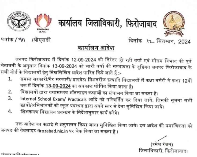 आपको बता दें मौसम विभाग ने मैनपुरी जिले में भारी बारिश की चेतावनी दी है। ऐसे में सुरक्षा की दृष्टि से जिलाधिकारी ने बड़ा आदेश दिया है। वहीं जिले में बीते 36 घंटे से ज्यादा वक्त से लगातार बारिश हो रही है। इसके अलावा फिरोजाबाद में भारी बारिश के चलते जिलाधिकारी रमेश रंजन के आदेशानुसार 13 सितंबर 2024 को नर्सरी से कक्षा 12 तक के सभी स्कूल बंद रहेंगे।
