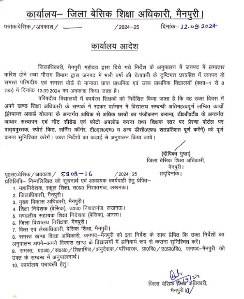 उत्तर प्रदेश के मैनपुरी जिले के जिलाधिकारी के आदेश के बाद जिला बेसिक शिक्षा अधिकारी दीपिका गुप्ता ने 13 सितंबर शुक्रवार को जिले के सभी बोर्ड के स्कूलों की कक्षा 1 से 8 तक छुट्टी करने का आदेश जारी किया है। जिलाधिकारी के आदेश के बाद सरकारी, गैर सरकारी और परिषदीय स्कूल बंद रहेंगे।