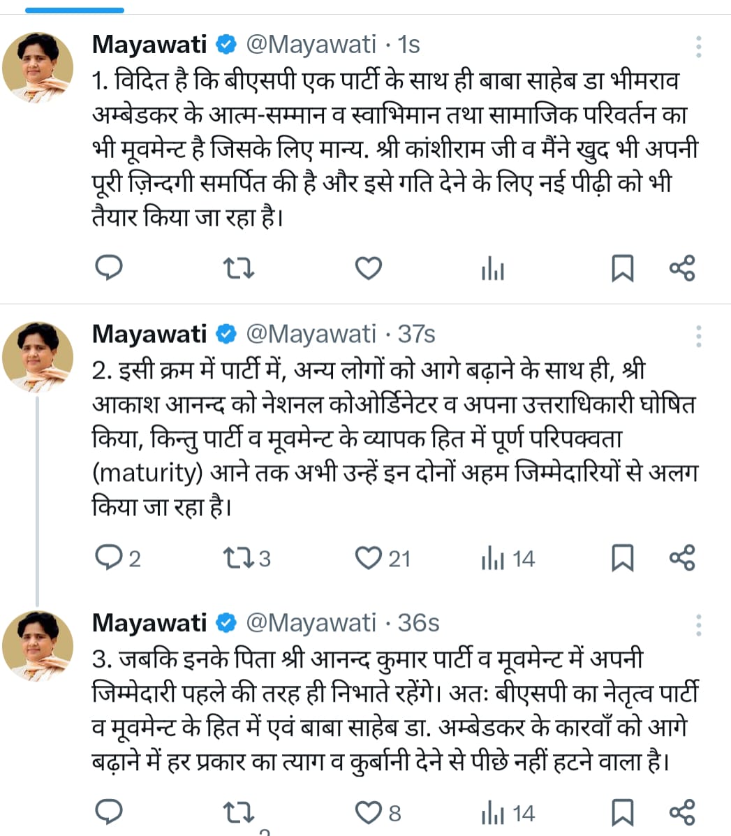 सूत्रों से मिली जानकारी के अनुसार आकाश आनंद को पार्टी के नेशनल कोऑर्डिनेटर पद से भी हटाया गया है। इस मामले पर जानकारी देते हुए मायावती ने आकाश आनंद को अपरिपक्व नेता कहा है।