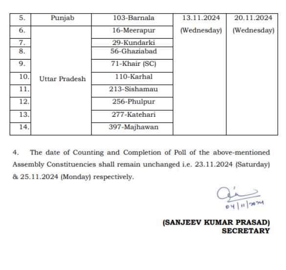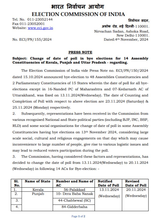 भारतीय निर्वाचन आयोग ने प्रेस नोट जारी करते हुए कहा कि कई सामाजिक, सांस्कृतिक और धार्मिक आयोजनों के कारण चुनावी तारीखों में तब्दीली की गई है। इसके लिए भारतीय जनता पार्टी, रालोद, कांग्रेस और बसपा समेत कई सामाजिक संगठनों ने तारीख बदलने की बात कही थी। ऐसे में केरल, पंजाब और उत्तर प्रदेश को मिलाकर कुल 14 राज्यों की विधानसभा सीटों पर चुनाव 20 नवंबर को होगा। वहीं नतीजे 23 नवंबर को घोषित किए जाएंगे।